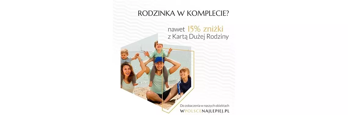 Posiadacze Karty Dużej Rodziny mogą korzystać nawet do 15 proc. zniżki na noclegi oraz na gastronomię w hotelach i obiektach grupy PHH. Zniżki obowiązują wyłącznie w przypadku dokonania rezerwacji poprzez bezpośrednie kanały obiektu, czyli telefonicznie lub mailowo. Możliwa jest również rezerwacja na miejscu. Nie obejmują rezerwacji dokonanych za pośrednictwem innych podmiotów lub stron internetowych pośredników oraz nie łączą się z innymi promocjami. Zniżki zostaną naliczone przy meldowaniu po okazaniu Karty Dużej Rodziny. Informacje o obiektach grupy PHH, w których obowiązuje Karta Dużej Rodziny można znaleźć na stronie www.wpolscenajlepiej.pl.