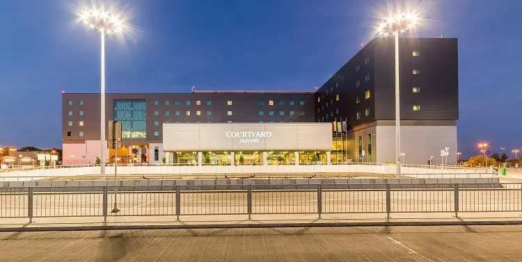 Czterogwiazdkowy Hotel Courtyard by Marriott Warsaw Airport usytuowany jest naprzeciwko terminalu na Lotnisku Chopina w Warszawie i jest pierwszym hotelem tej marki w Polsce. Obiekt posiada 241 pokoi i 13 sal konferencyjnych o powierzchni prawie 764 m kw. W momencie otwarcia w 2003 roku, obiekt był jedynym hotelem zlokalizowanym w bezpośrednim sąsiedztwie lotniska w Polsce. Sukces hotelu zapoczątkował inne inwestycje hotelowe zlokalizowane w pobliżu lotnisk w Polsce. Co roku z usług hotelu korzysta prawie 90 tys. gości. Courtyard by Marriott Warsaw Airport był wielokrotnie nagradzany międzynarodowymi nagrodami, m.in. w 2021 roku zajął pierwsze miejsce w rankingu wszystkich 1273 hoteli marki Courtyard na świecie oraz pierwsze miejsce w Europie wśród wszystkich hoteli sieci Marriott, pozyskując najwięcej nowych uczestników programu lojalnościowego Marriott Bonvoy