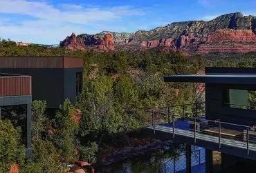Nie ma przesady w stwierdzeniu, że to miejsce niepowtarzalne. Zespół wzniesionych ponad ziemię mieszkalnych kubików pozwala sycić oczy skalistym pejzażem kanionu Red Rock w Arizonie. Zaczerpnięte z przyrody barwy i kształty powracają w luksusowych wnętrzach kompleksu – w postaci wielkoformatowych grafik ściennych Glamora z kolekcji Creative Collection, które w Polsce można nabyć u wyłącznego dystrybutora marki – sieci salonów z wyposażeniem wnętrz Dekorian Home.